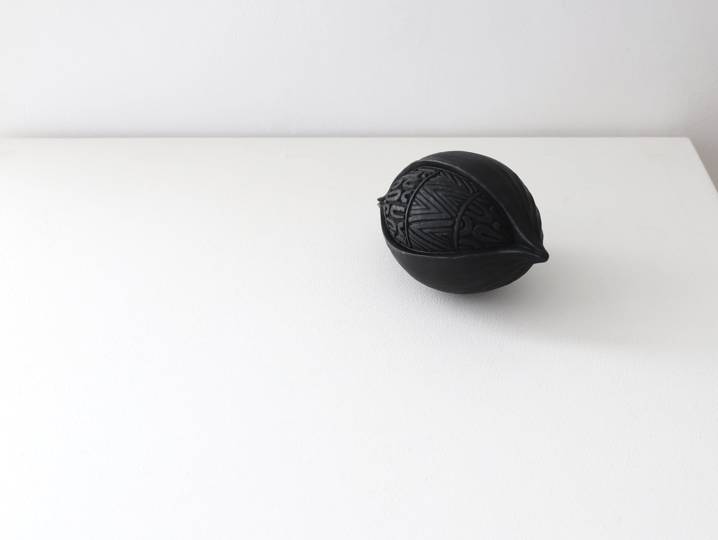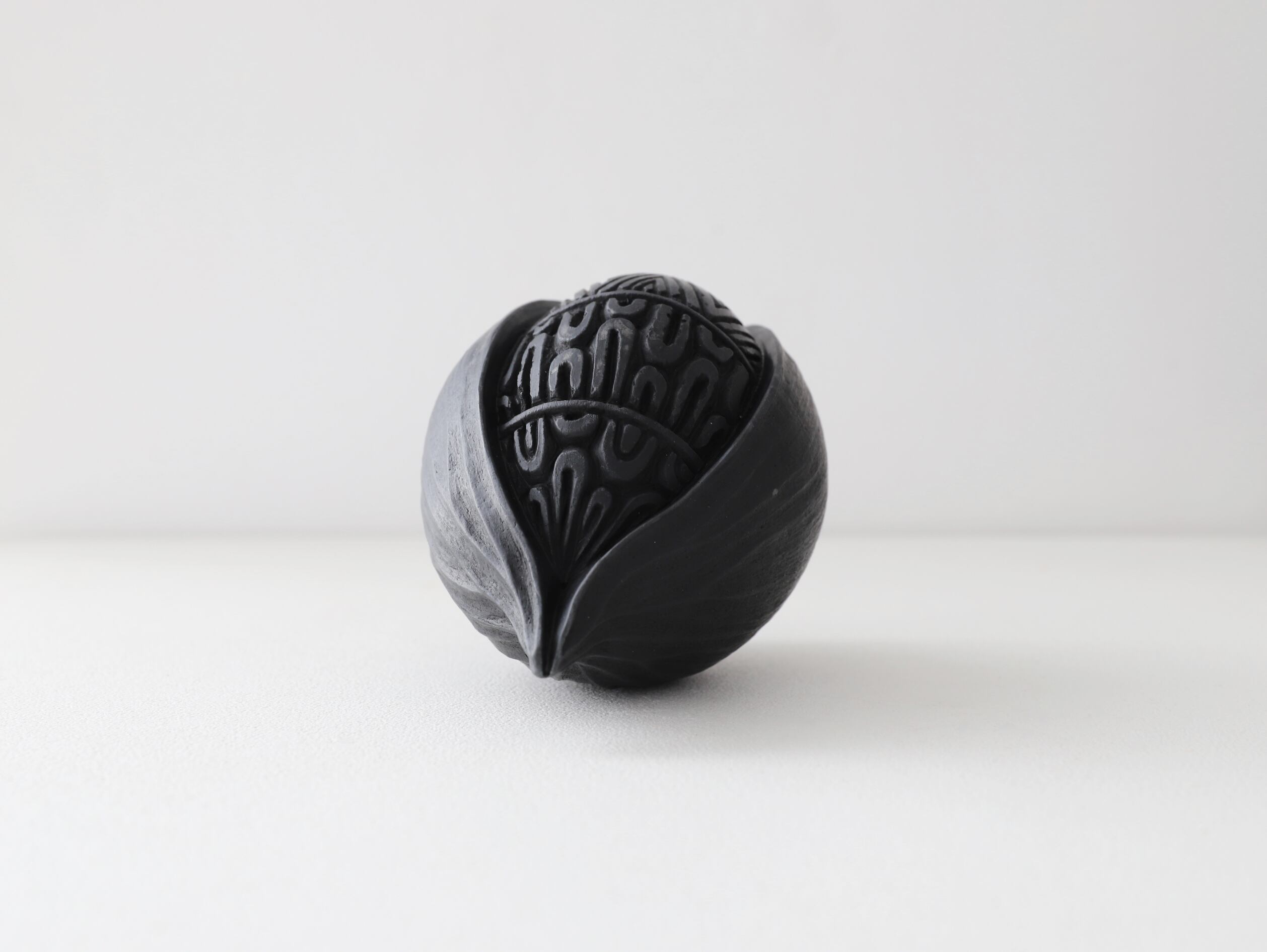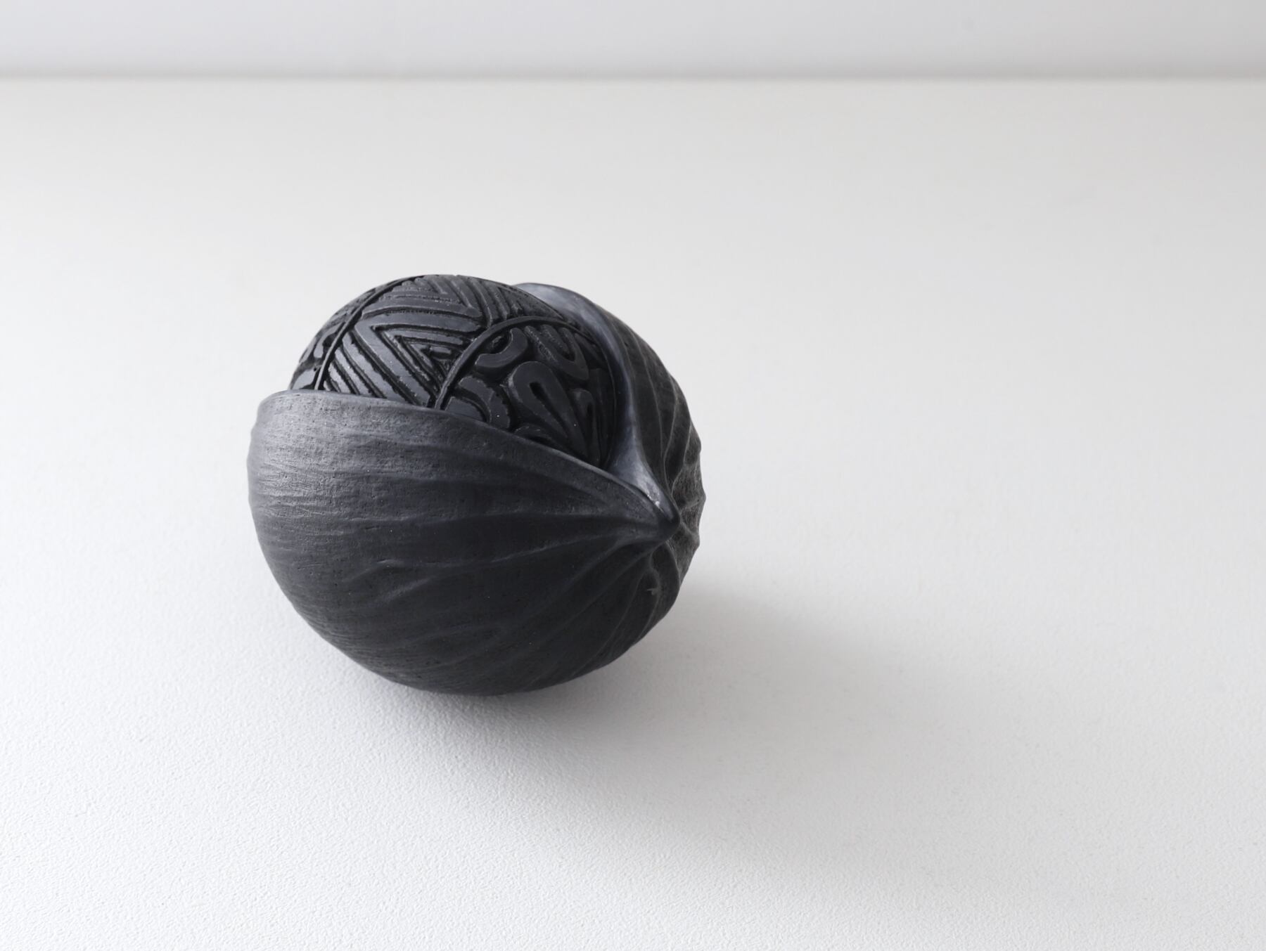 成形後、生乾きの状態で表面を石や金属、木のヘラなどを使って光沢が出るまで磨き締め、低めの温度で炭化焼成(生地に炭素を吸着させる焼き方)をし、黒い艶のある土器に焼き上げています。