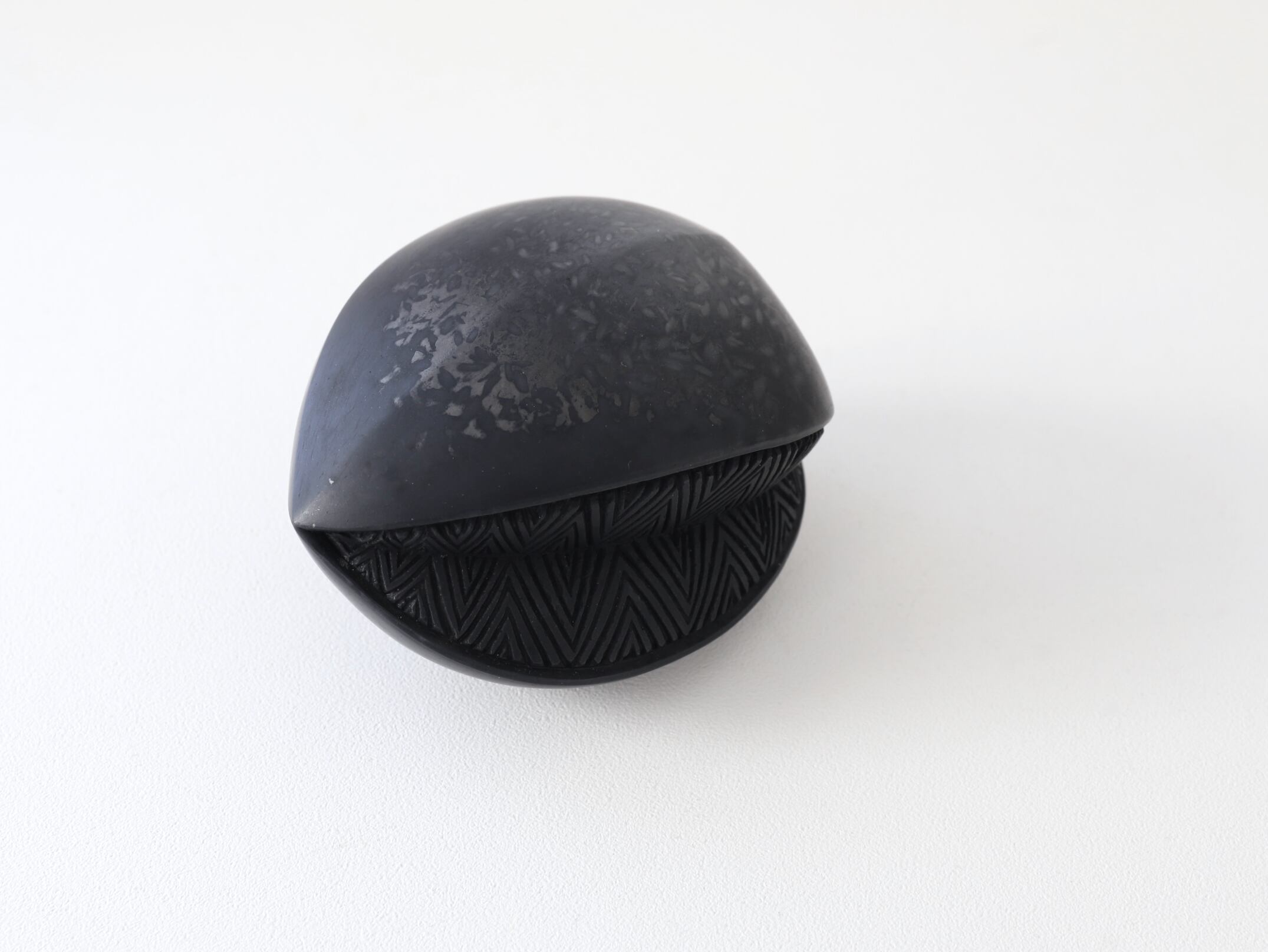 成形後、生乾きの状態で表面を石や金属、木のヘラなどを使って光沢が出るまで磨き締め、低めの温度で炭化焼成(生地に炭素を吸着させる焼き方)をし、黒い艶のある土器に焼き上げています。
