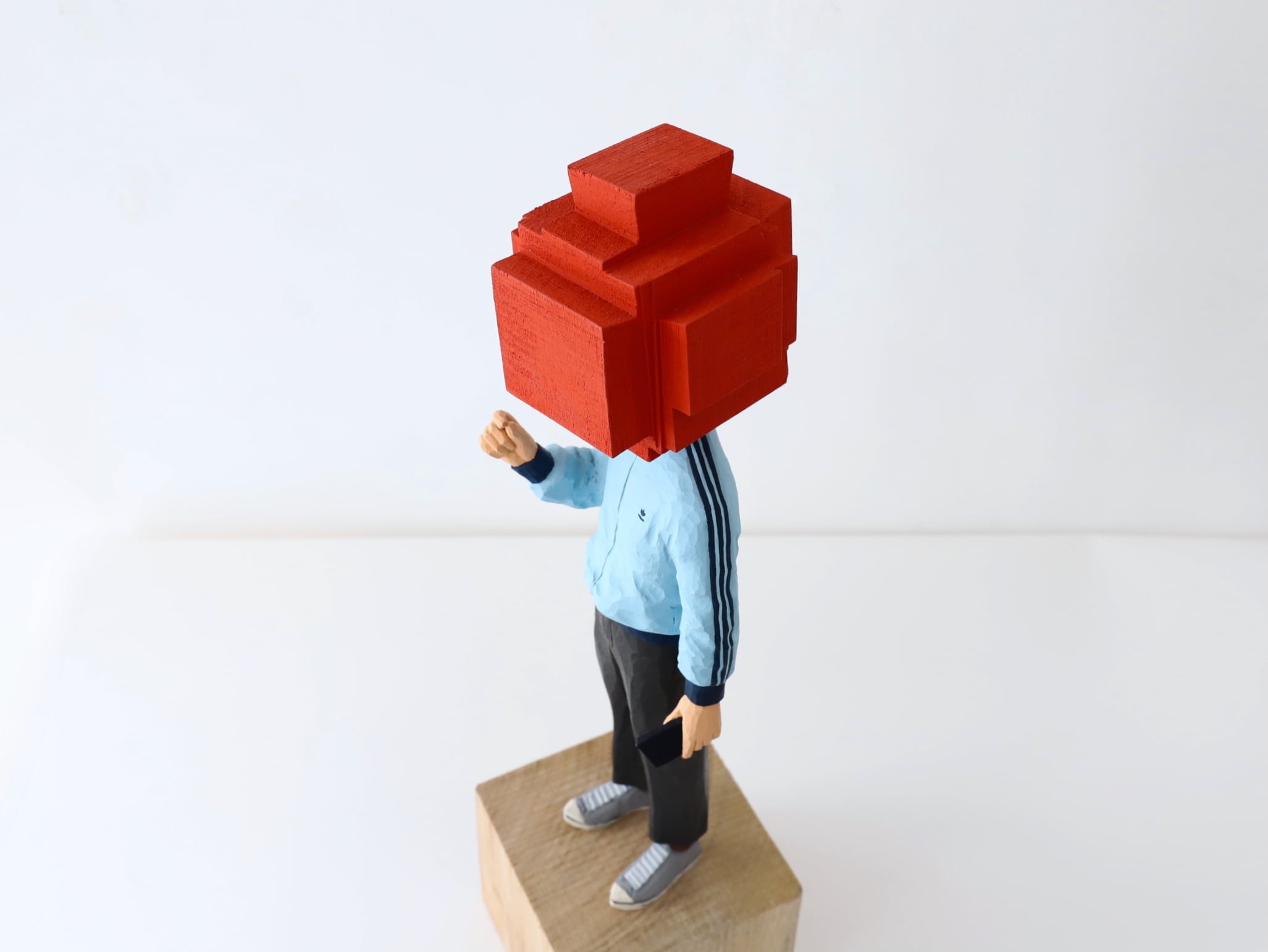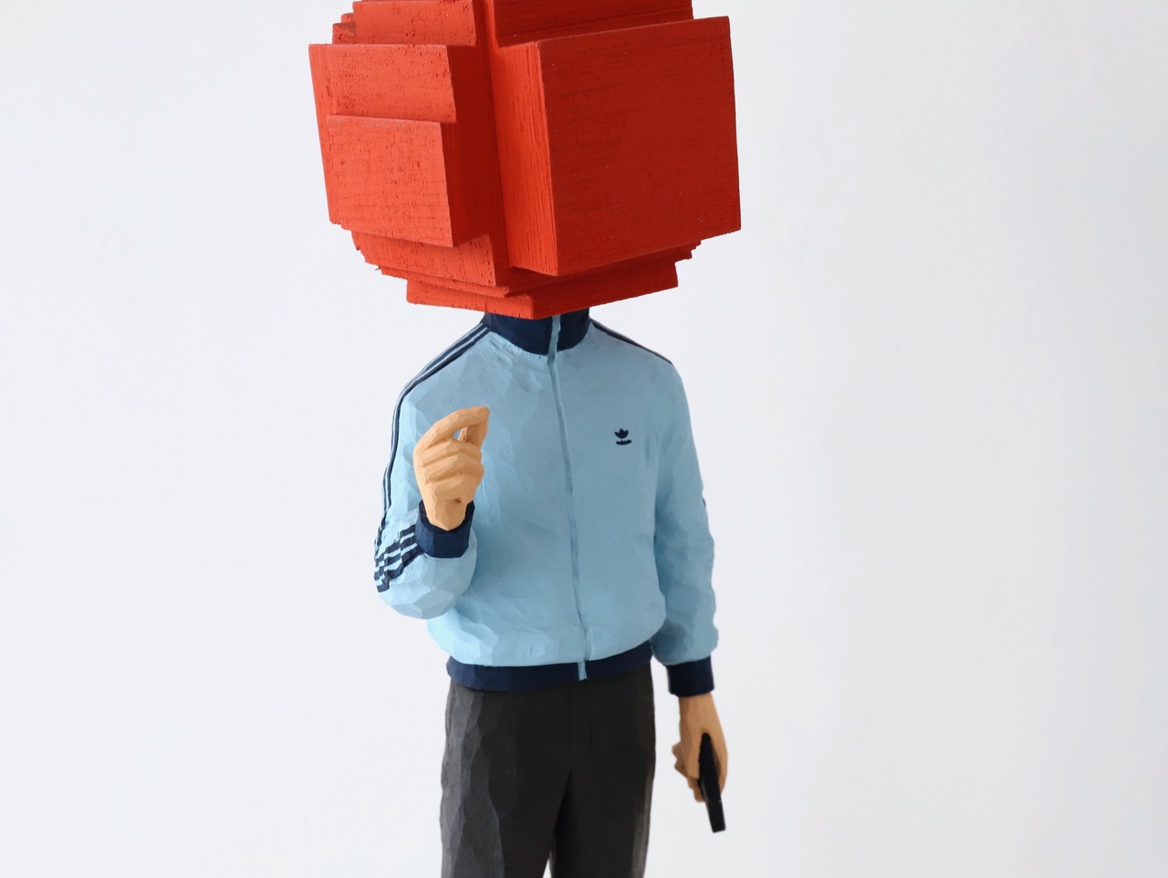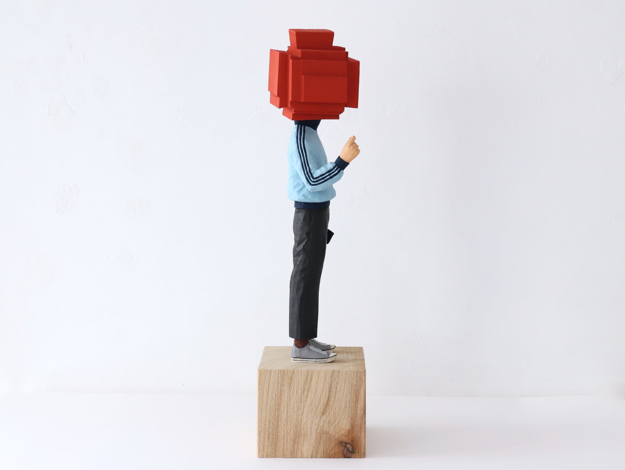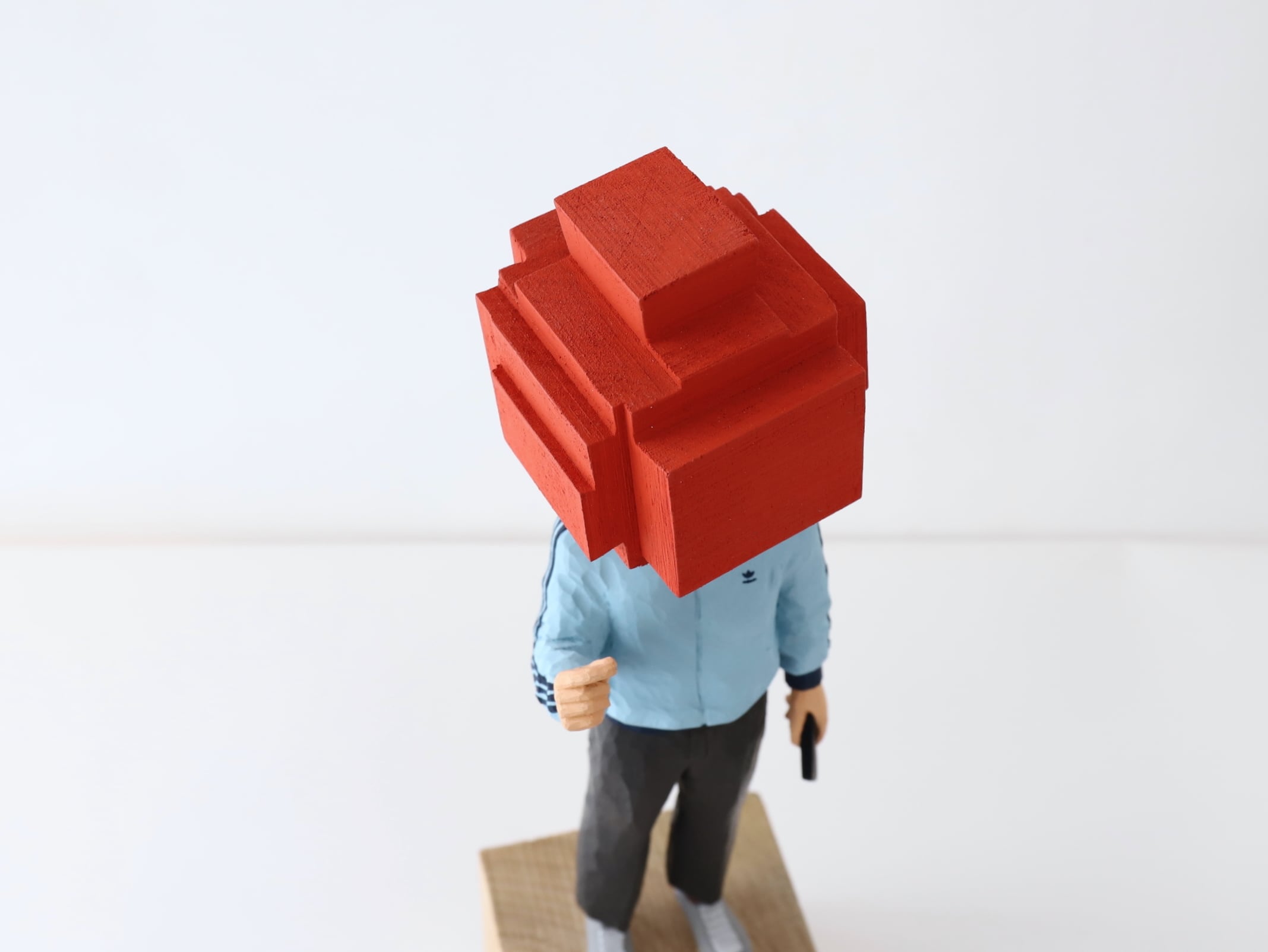 カラフルで幾何学的な立体の頭部を持つ、 美藤圭作品 「 people of peace 」 (平和の民) 。